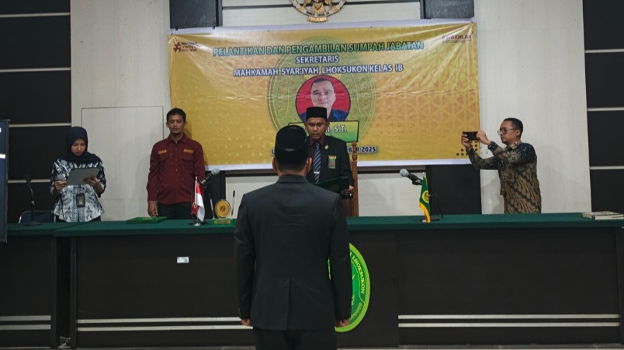 Ketua Mahkamah Syar’iyah Kuala Simpang Bapak Surya Darma Panjaitan, S.H.I., M.H. turut menghantar dan menghadiri beserta rombongan aparatur MS Kuala Simpang pada acara tersebut di Ruang Sidang Utama MS Lhoksukon. Acara Pelantikan dan Pengambilan Sumpah Jabatan dipimpin langsung oleh Ketua MS Lhoksukon Bapak Muzakir, S.H.I., M.H. pada pukul 14.30 WIB, Jumat (26/09/2025). Acara diakhiri dengan doa bersama dan pemberian ucapan selamat dari seluruh hadirin dalam suasana penuh kekeluargaan dan kebersamaan.