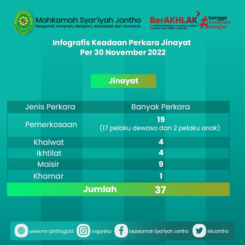 Hingga 30 November 2022, kasus jinayat yang ditanggani MS Jantho sebanyak 37 kasus. Mayoritas adalah kasus pemerkosaan,” ujar Fadlia.