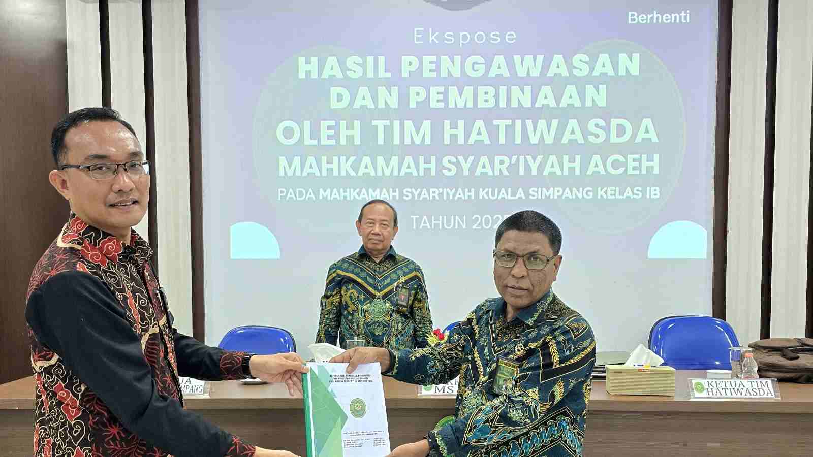 Hakim Tinggi Pengawas Daerah Mahkamah Syar'iyah Aceh Bapak Dr. Drs. Amiruddin, S.H., M.H. selaku Ketua Tim bersama anggota tim diantaranya Bapak Mashuri, S.Ag. dan Ibu Yani Riyanti, S.E., M.Si. dalam kunjungan kerja pada Mahkamah Syar'iyah Kuala Simpang berlangsung selama 2 hari pada hari Rabu, 5 November 2025 sampai dengan hari Kamis 6 November 2025, dengan agenda melaksanakan Pembinaan dan Pengawasan kepada seluruh jajaran di Mahkamah Syar'iyah Kuala Simpang. Kedatangan Tim HATIWASDA MS Aceh disambut hangat oleh Ketua Mahkamah Syar'iyah Kuala Simpang Bapak Surya Darma Panjaitan, S.H.I., M.H. beserta seluruh aparatur MS Kuala Simpang.